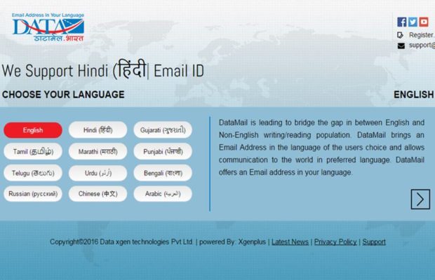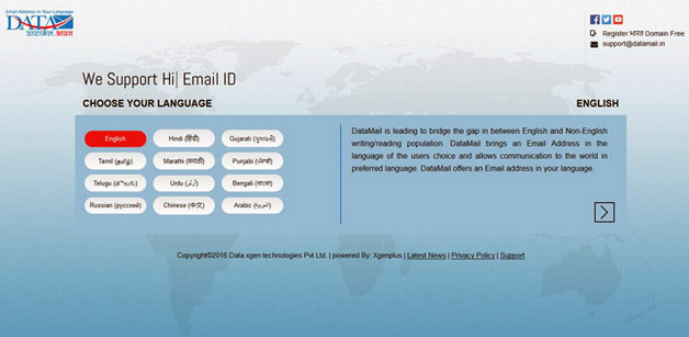 One of India’s largest IT services organisation, DATA XGen Technologies Pvt Ltd, a group company of Jaipur-based Data Infosys in October had launched world’s first free linguistic email address for Smartphones under the name ‘DATAMAIL’ that allowed to create email id in eight Indian launguages — Hindi, Urdu, Gujarati, Punjabi, Tamil, Telgu, Bangali, Marathi, English; and three foreign languages — Arabic, Russian and Chinese. Sources: theindianxpress.com,avashya.com,dqindia.com